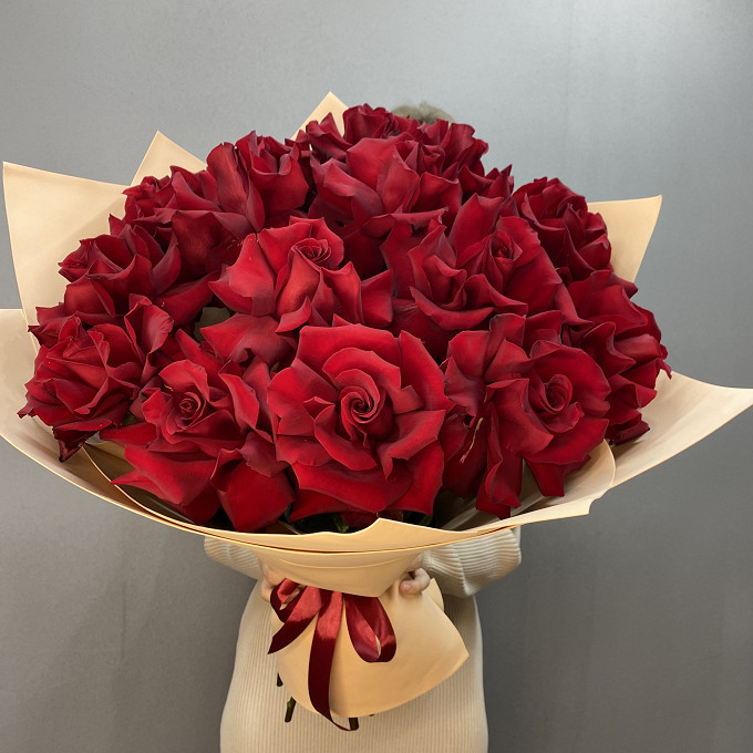 25 красных роз Кения, 40 см в зелёной матовой плёнке