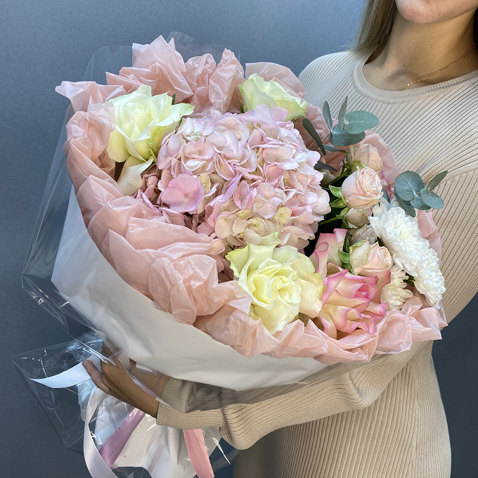 Букет Мечтай! с голубыми гортензиями и эвкалиптом