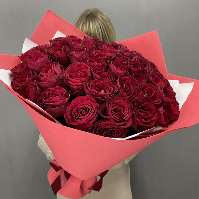 101 красная роза Кения, 40 см в красной матовой плёнке