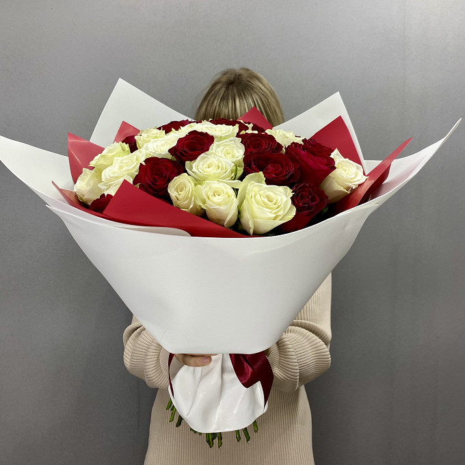 51 белая роза Кения, 40 см в красной матовой плёнке